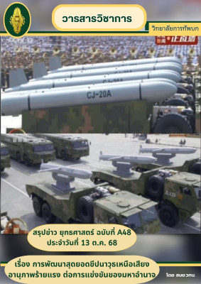 สมย.วทบ. ได้จัดทำสรุปข่าว ยุทธศาสตร์ ฉบับที่ A48 ประจำวันที่ 13 ต.ค. 68 เรื่อง ขีปนาวุธของจีนในพิธีสวนสนาม เพื่อรำลึกครบรอบ 80 ปีแห่งชัยชนะในสงครามต่อต้านการรุกรานของญี่ปุ่นและสงครามต่อต้านฟาสซิสต์โลก