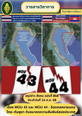 สมย.วทบ. ได้จัดทำสรุปข่าว สังคม ฉบับที่ B48 ประจำวันที่ 14 ต.ค. 68 เรื่อง MOU 43 และ MOU 44 : ข้อตกลงชายแดนไทย–กัมพูชา กับอนาคตความสัมพันธ์สองประเทศ