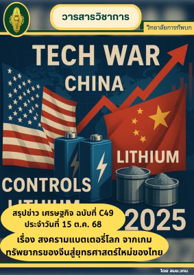 สมย.วทบ. ได้จัดทำสรุปข่าว เศรษฐกิจ ฉบับที่ C49 ประจำวันที่ 15 ต.ค. 68 เรื่อง สงครามแบตเตอรี่โลก จากเกมทรัพยากรของจีนสู่ยุทธศาสตร์ใหม่ของไทย