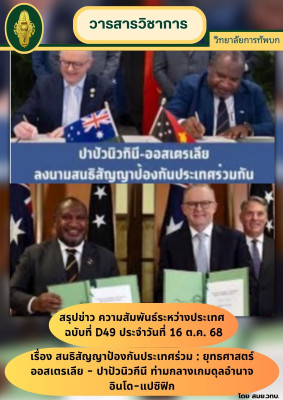 สมย.วทบ. ได้จัดทำสรุปข่าว ความสัมพันธ์ระหว่างประเทศ ฉบับที่ D49 ประจำวันที่ 16 ต.ค. 68 เรื่อง สนธิสัญญาป้องกันประเทศร่วม : ยุทธศาสตร์ออสเตรเลีย - ปาปัวนิวกีนี ท่ามกลางเกมดุลอำนาจอินโด-แปซิฟิก