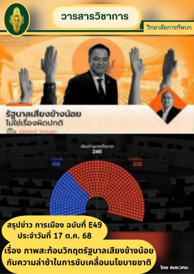 สมย.วทบ. ได้จัดทำสรุปข่าวการเมือง ฉบับ E49 ประจำวันที่ 17 ต.ค. 68 เรื่อง ภาพสะท้อนวิกฤตรัฐบาลเสียงข้างน้อยกับความล่าช้าในการขับเคลื่อนนโยบายชาติ