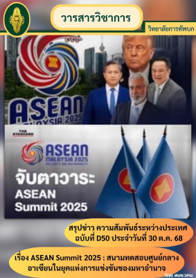 สมย.วทบ. ได้จัดทำสรุปข่าว ความสัมพันธ์ระหว่างประเทศ ฉบับที่ D51 ประจำวันที่ 30 ต.ค. 68 เรื่อง ASEAN Summit 2025 : สนามทดสอบศูนย์กลางอาเซียนในยุคแห่งการแข่งขันของมหาอำนาจ