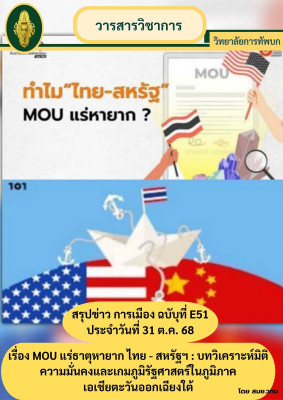 สมย.วทบ. ได้จัดทำสรุปข่าว การเมือง ฉบับที่ E51 ประจำวันที่ 31 ต.ค. 68 เรื่อง MOU แร่ธาตุหายาก ไทย - สหรัฐฯ : บทวิเคราะห์มิติความมั่นคงและเกมภูมิรัฐศาสตร์ในภูมิภาคเอเชียตะวันออกเฉียงใต้