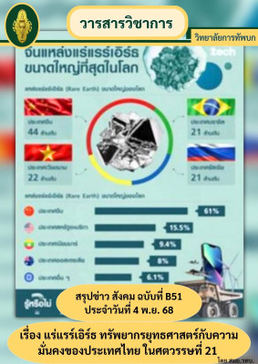 สมย.วทบ. ได้จัดทำสรุปข่าว สังคม ฉบับที่ B51 ประจำวันที่ 4 พ.ย. 68 เรื่อง แร่แรร์เอิร์ธ ทรัพยากรยุทธศาสตร์กับความมั่นคงของประเทศไทย ในศตวรรษที่ 21