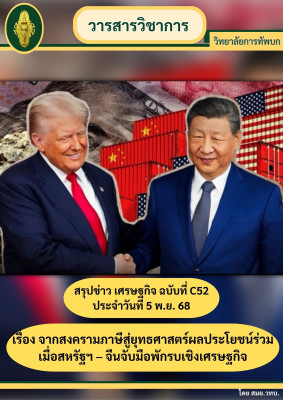 สมย.วทบ. ได้จัดทำสรุปข่าว เศรษฐกิจ ฉบับที่ C52 ประจำวันที่ 5 พ.ย. 68 เรื่อง จากสงครามภาษีสู่ยุทธศาสตร์ผลประโยชน์ร่วมเมื่อสหรัฐฯ – จีนจับมือพักรบเชิงเศรษฐกิจ