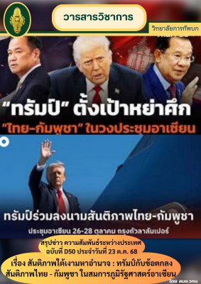 สมย.วทบ. ได้จัดทำสรุปข่าว ความสัมพันธ์ระหว่างประเทศ ฉบับที่ D50 ประจำวันที่ 23 ต.ค. 68 เรื่อง สันติภาพใต้เงามหาอำนาจ : ทรัมป์กับข้อตกลงสันติภาพไทย - กัมพูชา ในสมการภูมิรัฐศาสตร์อาเซียน