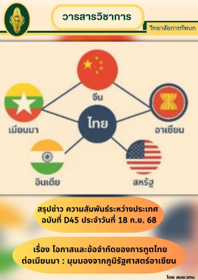 สรุปข่าวความสัมพันธ์ระหว่างประเทศ ฉบับที่ D45 ประจำวันที่ 18 ก.ย. 68 เรื่อง โอกาสและข้อจำกัดของการทูตไทยต่อเมียนมา: มุมมองจากภูมิรัฐศาสตร์อาเซียน
