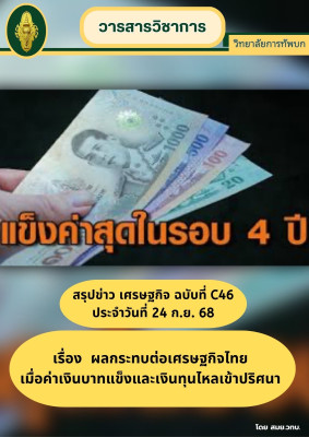 สรุปข่าวเศรษฐกิจ ฉบับที่ C46 ลงวันที่ 24 ก.ย. 68 เรื่อง ผลกระทบต่อเศรษฐกิจไทย เมื่อค่าเงินบาทแข็งและเงินทุนไหลเข้าปริศนา