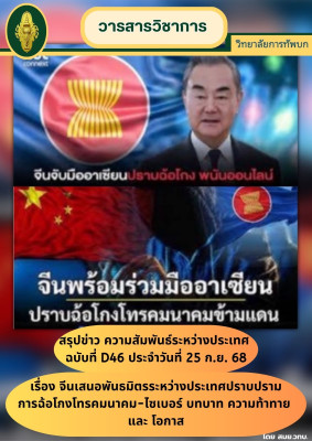 สรุปข่าวความสัมพันธ์ระหว่างประเทศ ฉบับที่ D46 ประจำวันที่ 25 ก.ย. 68 เรื่อง จีนเสนอพันธมิตรระหว่างประเทศปราบปรามการฉ้อโกงโทรคมนาคม-ไซเบอร์ บทบาท ความท้าทาย และ โอกาส