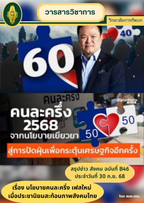 สรุปข่าวสังคม ฉบับที่ B46 ประจำวันที่ 30 ก.ย. 68 เรื่อง นโยบายคนละครึ่ง เฟสใหม่ เมื่อประชานิยมสะท้อนภาพสังคมไทย