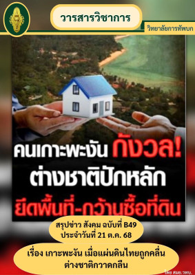 สมย.วทบ. ได้จัดทำสรุปข่าว สังคม ฉบับที่ B49 ประจำวันที่ 21 ต.ค. 68 เรื่อง เกาะพะงัน เมื่อแผ่นดินไทยถูกคลื่นต่างชาติกวาดกลืน
