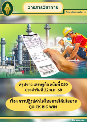 สมย.วทบ. ได้จัดทำสรุปข่าวเศรษฐกิจ ฉบับที่ C50 ประจำวันที่ 22 ต.ค. 68 เรื่อง การปฏิรูปค่าไฟไทยภายใต้นโยบาย Quick Big Win