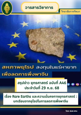 สรุปข่าวยุทธศาสตร์ ฉบับที่ A46 ประจำวันที่ 29 ก.ย. 68 เรื่อง Rare Earths และความมั่นคงทางยุทธศาสตร์ : บทเรียนจากยุโรปในการลดการพึ่งพาจีน